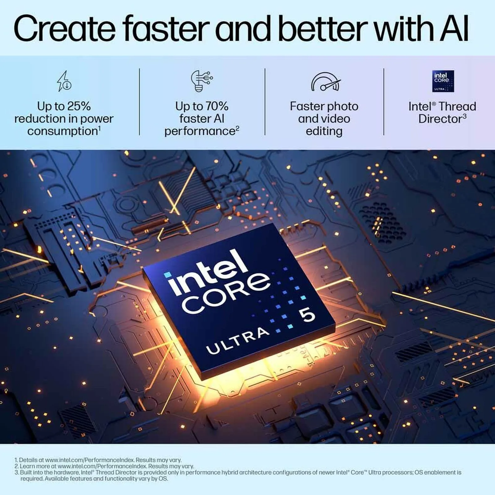Boost your productivity with Copilot, offering on-demand summaries and design assistance. Experience smooth workflows with the 12-core Intel® Core™ Ultra 5 125U processor, featuring 14 threads and 12MB L3 cache, along with Intel® graphics for seamless visuals.